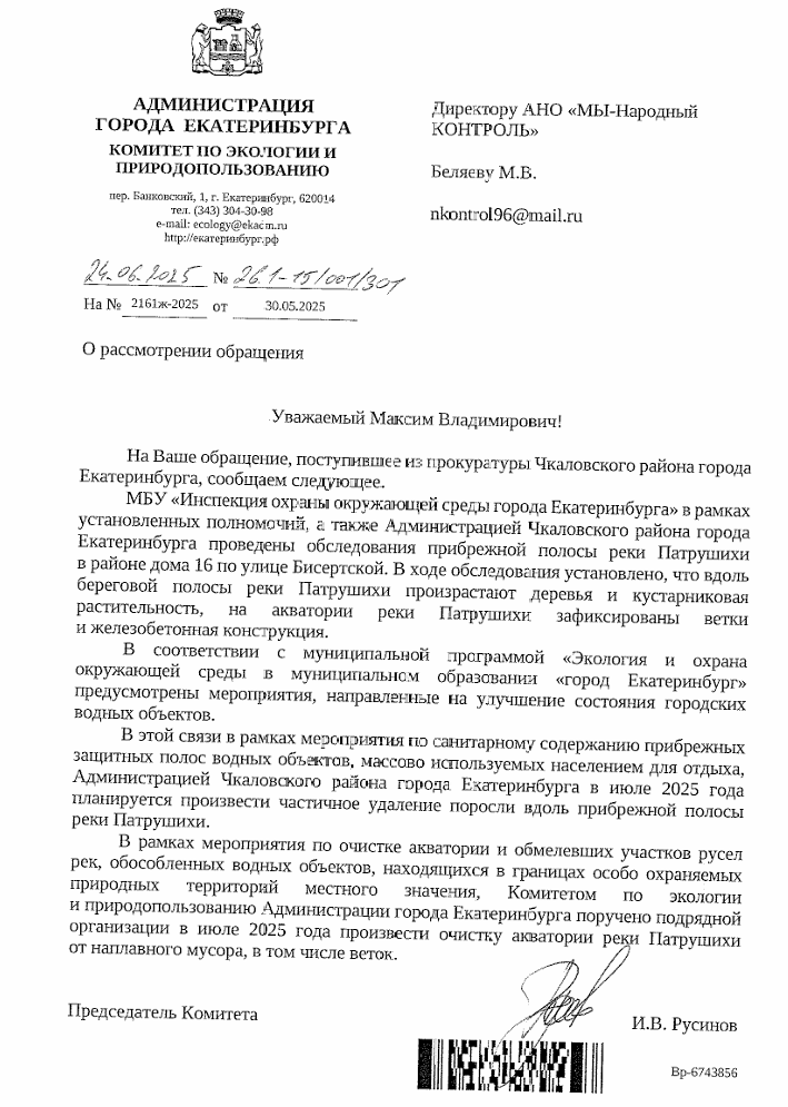 В конце мая из Екатеринбурга поступило обращение с просьбой очистить участок реки Патрушихи в районе дома № 16 по улице Бисертской от упавших деревьев. Жители напомнили, что администрация города ранее обещала выполнить работы весной, однако никаких действий предпринято не было.