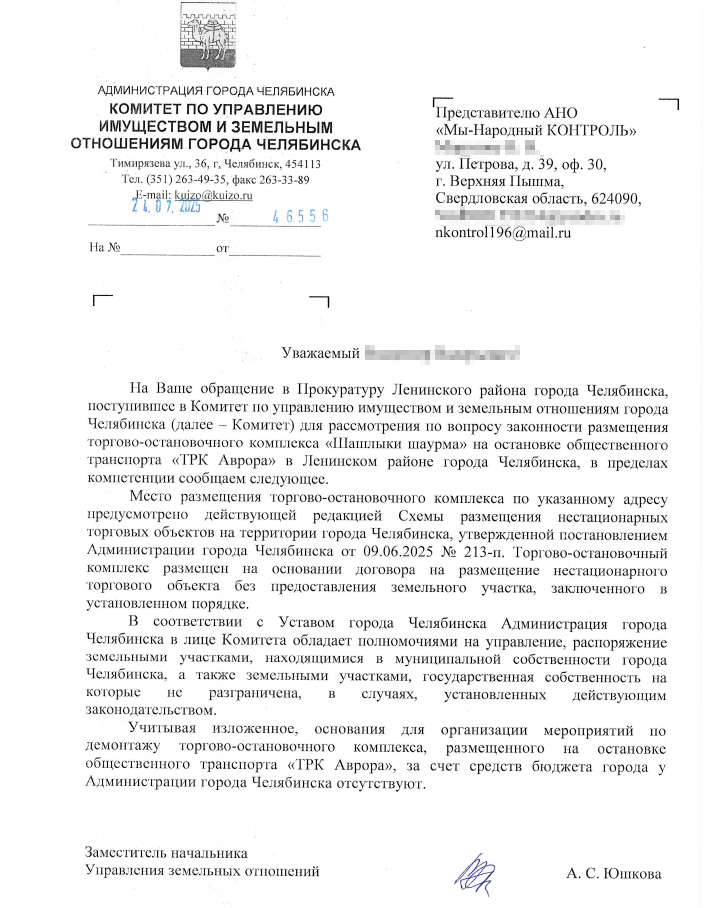 В ответ на обращение в прокуратуру Ленинского района Челябинска комитет по управлению имуществом сообщил, что комплекс размещён на законных основаниях, согласно утверждённой схеме и договору. При этом в администрации города уточнили, что оснований для демонтажа за счёт бюджета нет.