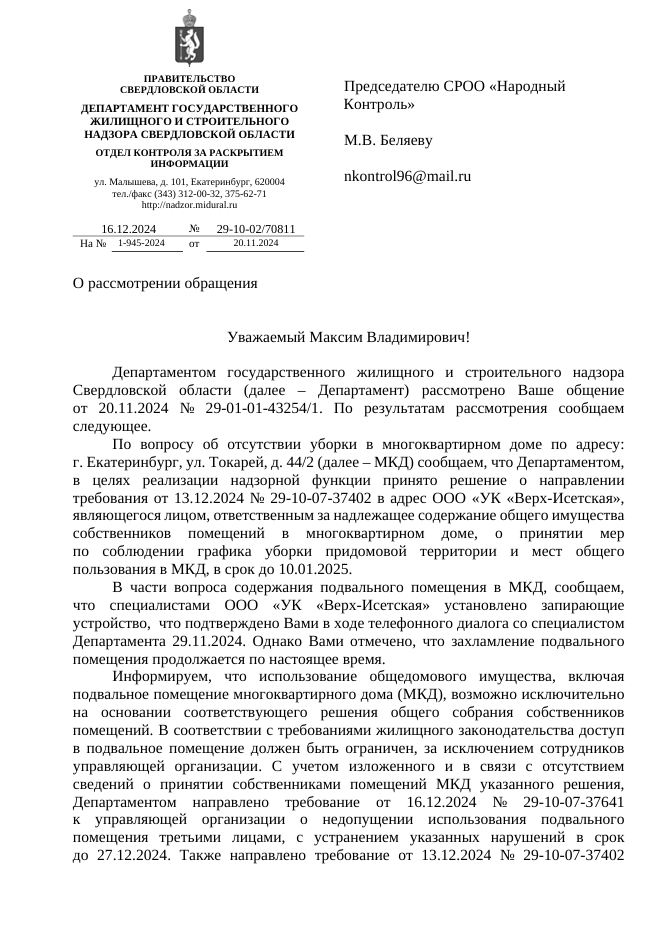 Департамент государственного жилищного и строительного надзора Свердловской области принял меры, направив требование к управляющей компании ООО «УК «Верх-Исетская» с требованием обеспечить уборку территории и приведение подвала в порядок, а также ограничить доступ посторонних лиц в подвал.