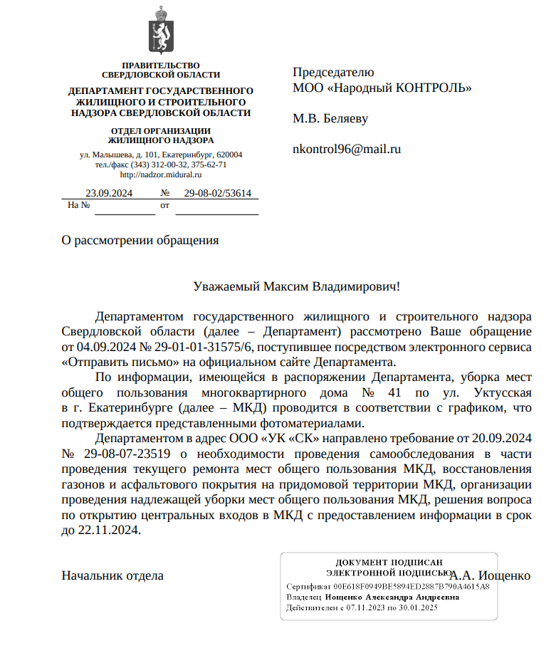 Согласно ответу, что уборка мест общего пользования по адресу проводится по графику, но управляющей компании направлено требование провести самообследование и устранить проблемы с текущим ремонтом, восстановлением газонов, асфальтового покрытия и открытием центральных входов.