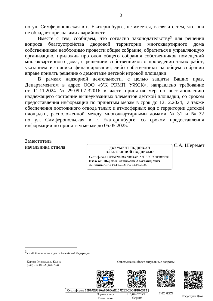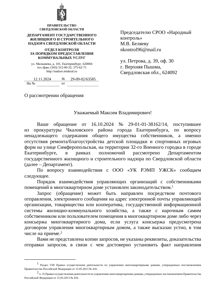 На это обращение Департаментом государственного жилищного и строительного надзора по Свердловской области был предоставлен ответ.