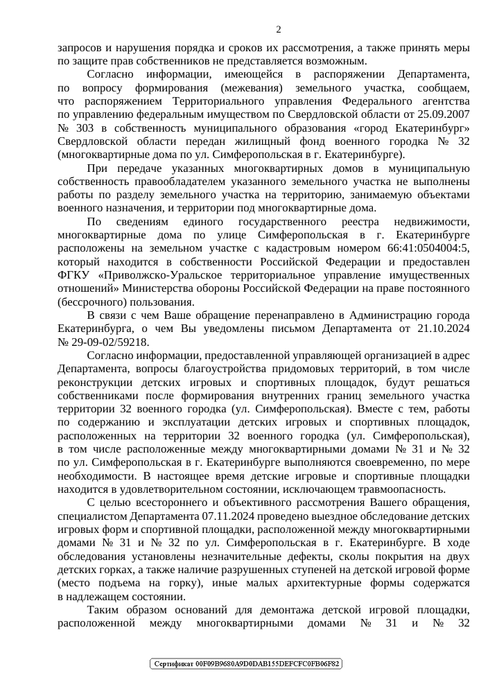 Ведомство разъяснило, что территория городка находится на земельном участке, принадлежащем Российской Федерации, и закреплена за Министерством обороны РФ. Управляющая компания сообщила, что вопросы благоустройства площадок возможно решить только после формирования внутренних границ земельного участка.