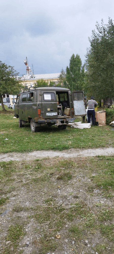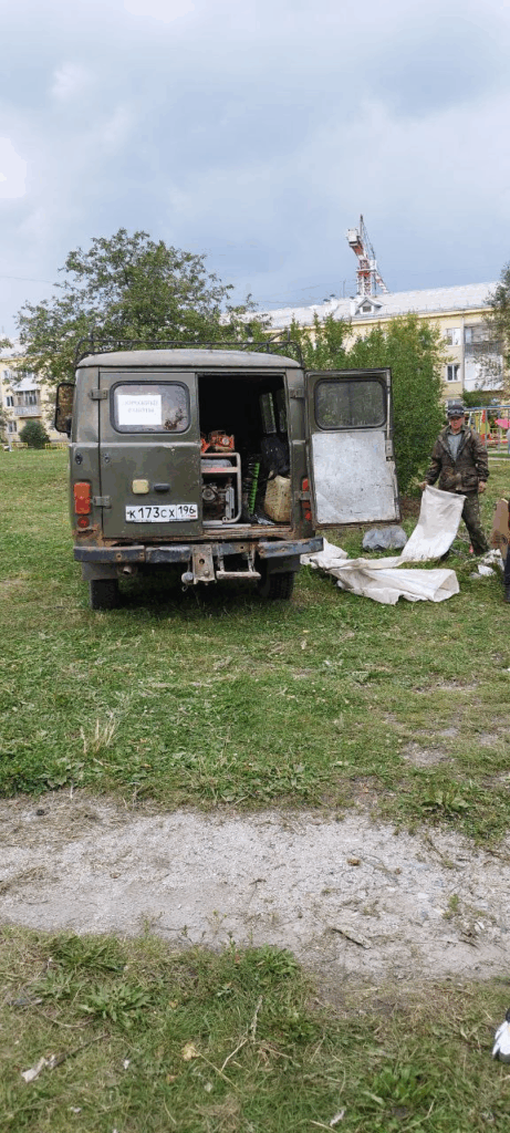 13.08.2025 г., 17:15. Координаты: 56.976596, 60.565045. г. Верхняя Пышма, ул. Менделеева, 4. Парковка на детской площадке, выгрузка скошенной травы.