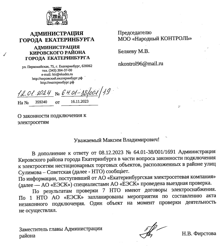 В дополнение к ответу от 08.12.2023 № 64.01-38/001/1691 Администрация Кировского района города Екатеринбурга в части вопроса законности подключения к электросетям нестационарных торговых объектов, расположенных в районе улиц Сулимова — Советская (далее — НТО) сообщает.