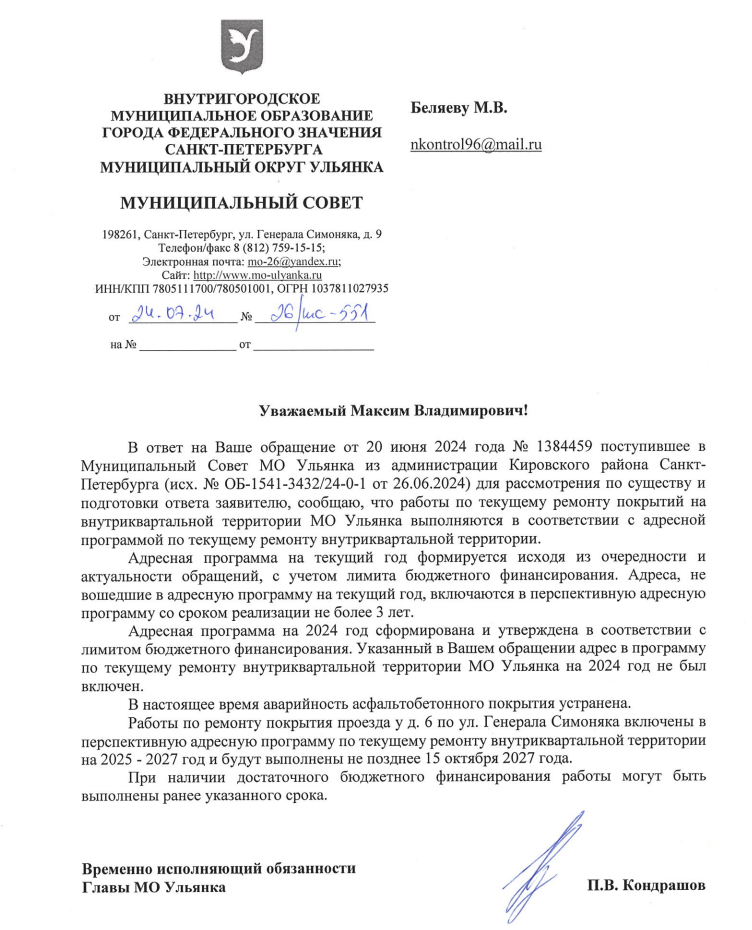 Дополнительный ответ из Санкт-Петербурга по вопросу ремонта дороги по ул. Генерала Симоняка