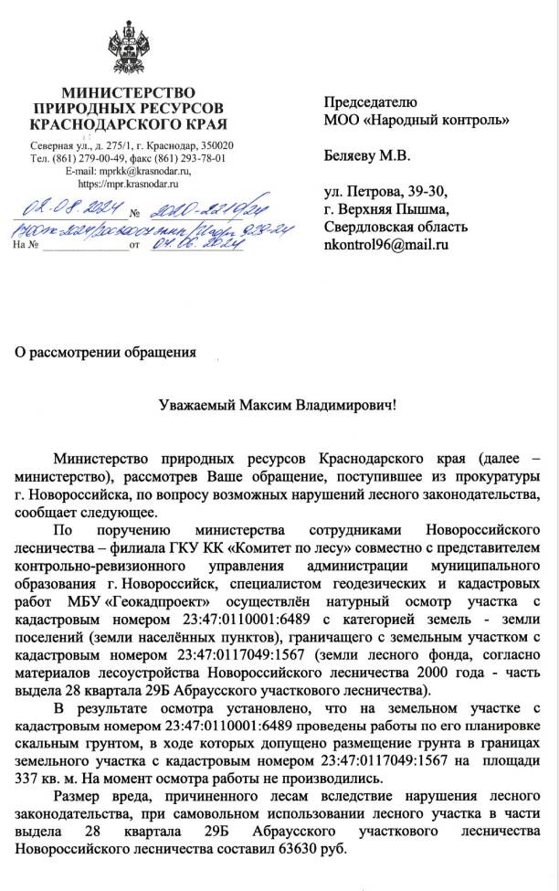 Министерство природных ресурсов Краснодарского края рассмотрело обращение прокуратуры г. Новороссийска о возможных нарушениях лесного законодательства.