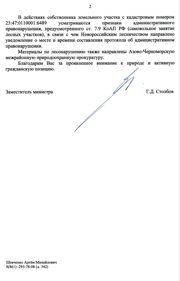 Площадь нарушения составила 337 кв. м, и размер причиненного вреда лесам оценивается в 63630 рублей. В действиях собственника первого участка усматриваются признаки административного правонарушения по ст. 7.9 КоАП РФ (самовольное занятие лесных участков). Новороссийское лесничество направило уведомление о составлении протокола об административном правонарушении и передало материалы по делу в Азово-Черноморскую межрайонную природоохранную прокуратуру.