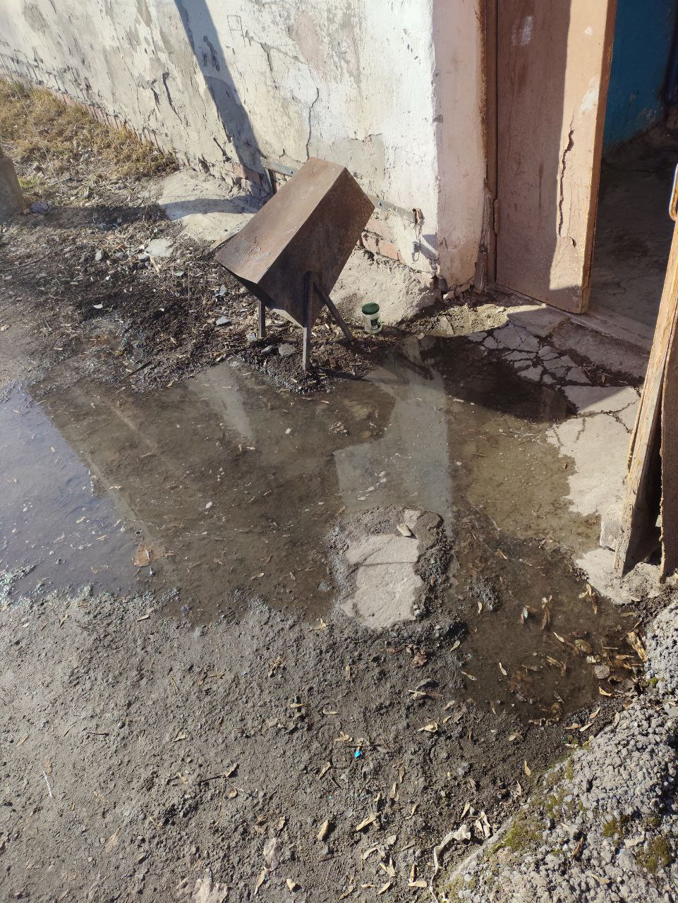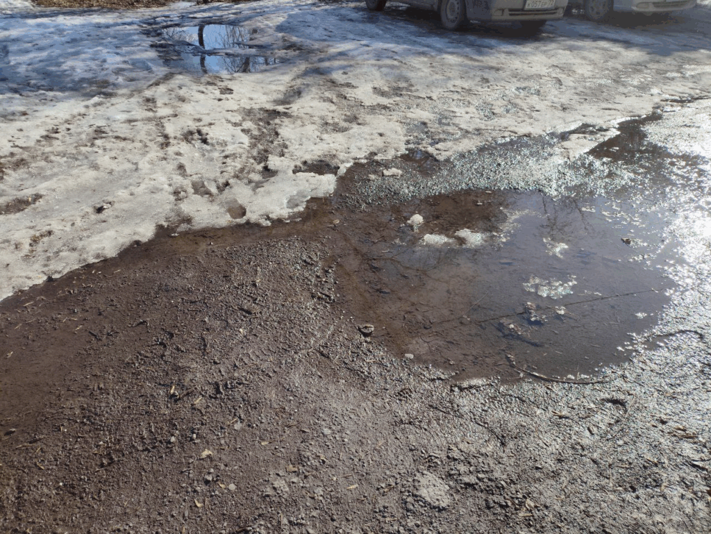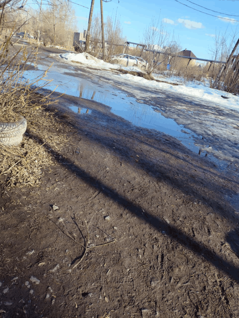 Отсутствует дорожное покрытие во дворе, дорога принадлежит городу. Ямы, выбоины. Из-за отсутствия уборки снега городом дорогу затопило. Пешеходы идут по лужам и грязи, тротуара нет.