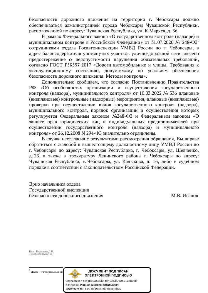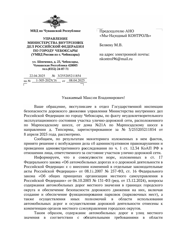 Благодарим неравнодушных граждан за Ваши обращения. Если Вы не согласны с данным ответом УМВД России по г. Чебоксары, пожалуйста, сообщите об этом Нам (желательно с фото/видео доказательствами выполнения работы в неполном объеме или ее невыполнении).