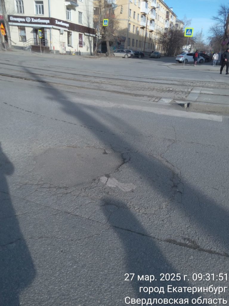 19 марта мы получили обращение из Екатеринбурга о глубокой яме на пешеходном переходе на перекрестке улицы Машиностроителей и Черниговского переулка.