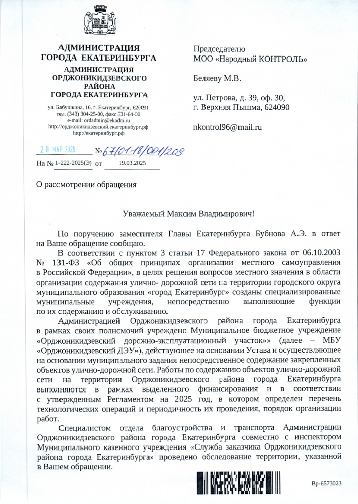 В ответ на это обращение администрация города сообщила, что вопросы содержания улично-дорожной сети решаются через муниципальные учреждения, такие как Муниципальное бюджетное учреждение «Орджоникидзевский дорожно-эксплуатационный участок».