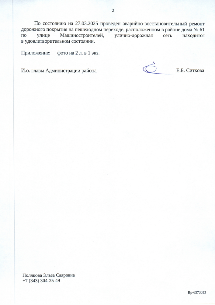 27 марта 2025 года на указанном пешеходном переходе был проведен аварийно-восстановительный ремонт дорожного покрытия. Специалисты администрации Орджоникидзевского района, совместно с инспекторами Муниципального казенного учреждения «Служба заказчика Орджоникидзевского района», обследовали территорию и подтвердили, что улично-дорожная сеть находится в удовлетворительном состоянии. Также к ответу были приложены фотоматериалы, подтверждающие выполненные работы.