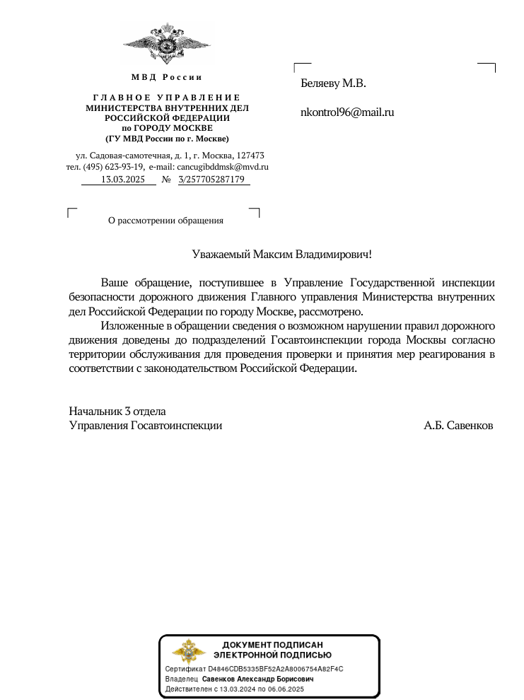 В ответ на эти обращения Управление ГИБДД ГУ МВД Российской Федерации по Москве сообщил, что все поступившие сведения о возможных нарушениях были переданы соответствующим подразделениям Госавтоинспекции. Там проведут необходимые проверки и примут меры реагирования в соответствии с законодательством Российской Федерации.