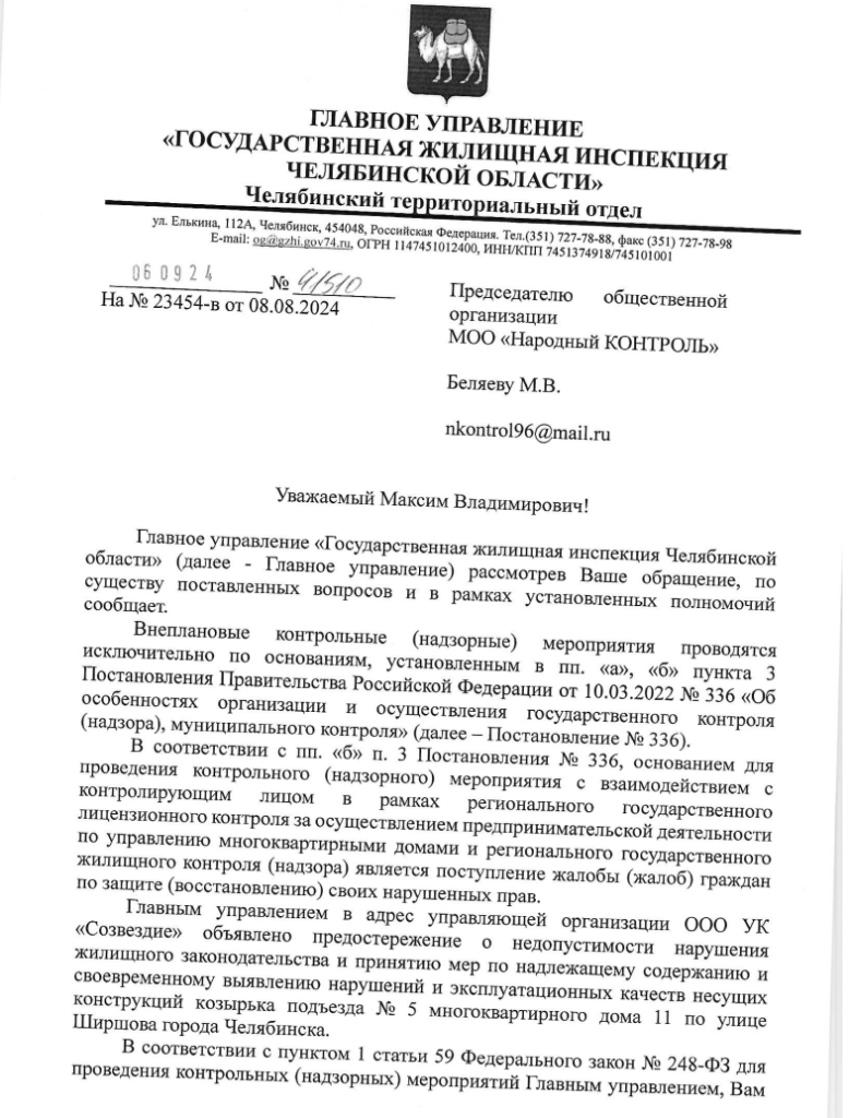 Главное управление «Государственная жилищная инспекция Челябинской области» рассмотрело ваше обращение и сообщает, что внеплановые контрольные мероприятия проводятся только по основаниям, установленным в Постановлении Правительства РФ от 10.03.2022 № 336. Основанием для контроля является поступление жалобы граждан о нарушении прав.