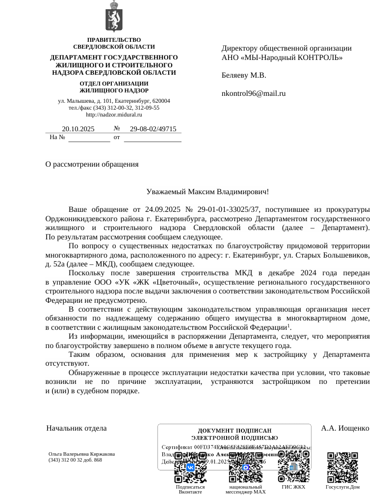В ответе разъясняется, что после передачи дома в управление УК «ЖК «Цветочный» ответственность за содержание общего имущества, включая дворовую территорию, несет управляющая организация. Что касается возможных строительных недостатков, Департамент рекомендовал жителям решать этот вопрос непосредственно с застройщиком в досудебном или судебном порядке.