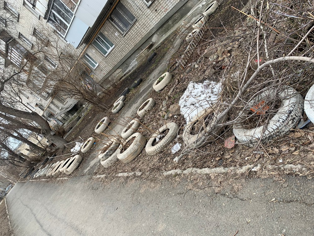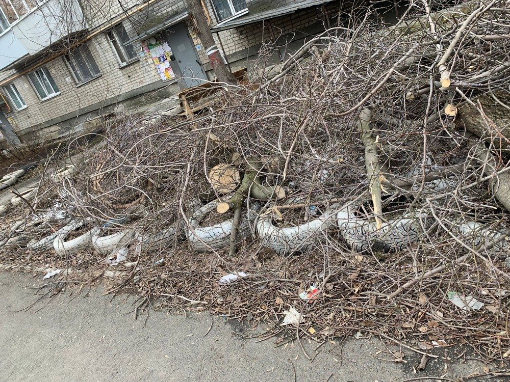 На придомовой территории проводился спил крон деревьев. Работы велись еще в конце марта и вот уже месяц как спиленные ветки никто, так и не убрал. По всей территории лежат автомобильные шины, которые были брошены кем-то очень давно и также не были убраны.