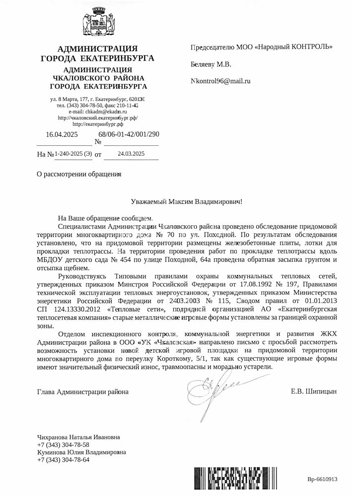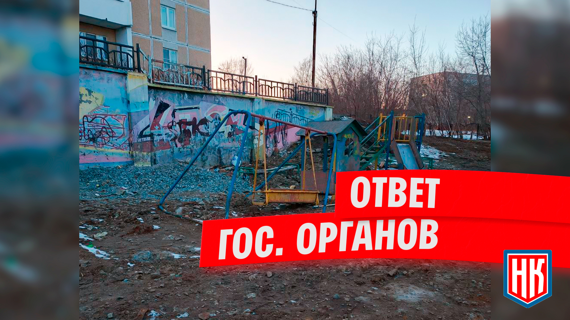 Администрация Чкаловского района сообщила, что на месте провели засыпку и отсыпку щебнем, а старые игровые элементы были перенесены за пределы охранной зоны. В управляющую компанию направлено письмо с просьбой рассмотреть возможность установки новой детской площадки, так как существующая находится в аварийном состоянии.