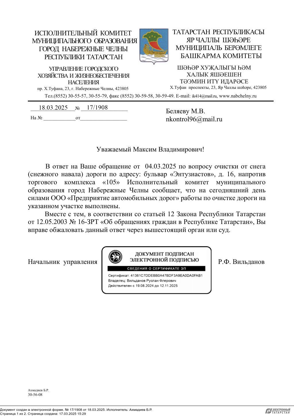 В ответ Исполнительный комитет города сообщил, что по состоянию на 4 марта работы по очистке указанного участка дороги возле дома 16 по бульвару Энтузиастов были выполнены силами ООО «Предприятие автомобильных дорог».