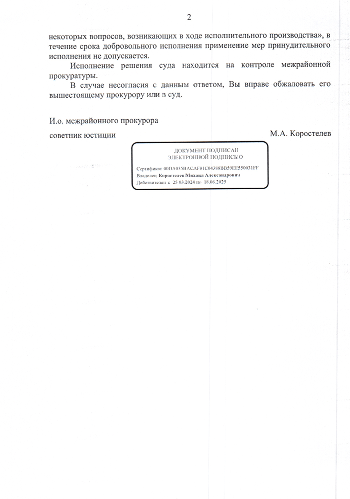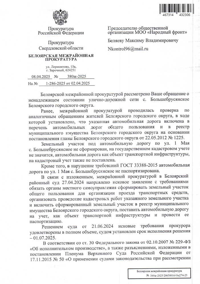 В ответе сообщается, что в связи с отсутствием кадастрового учета земельного участка и непаспортизации дороги, прокуратурой был подан иск в суд с требованием обязать органы местного самоуправления восстановить благоустройство и выполнить ряд действий. Суд удовлетворил иск и установил срок исполнения решения до 1 июля 2025 года.