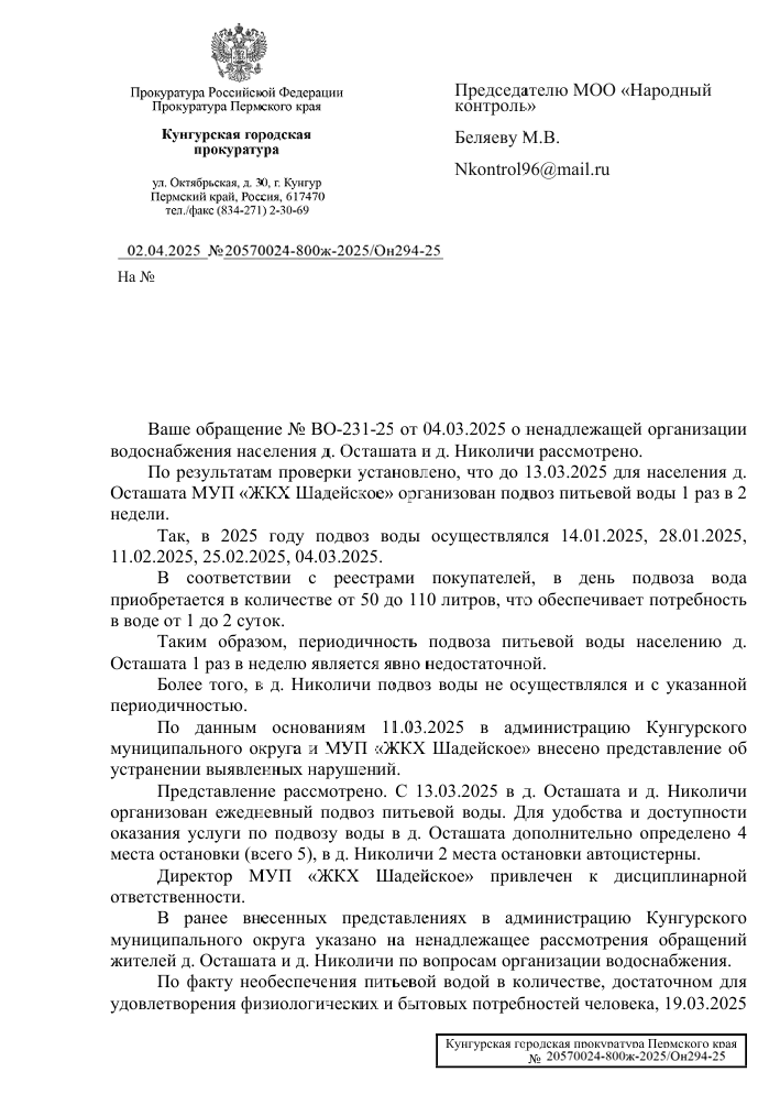 На это обращение был получен ответ от местной прокуратуры, в котором указано, что до 13 марта 2025 года для населения деревни Осташата был организован подвоз воды раз в две недели. Однако, периодичность подвоза, по мнению местных жителей, недостаточна, а в соседней деревне Николичи подвоз воды осуществлялся ещё реже. В ответе было также указано, что с 13 марта 2025 года организован ежедневный подвоз воды и дополнительно определены места остановки автоцистерн в обеих деревнях.
