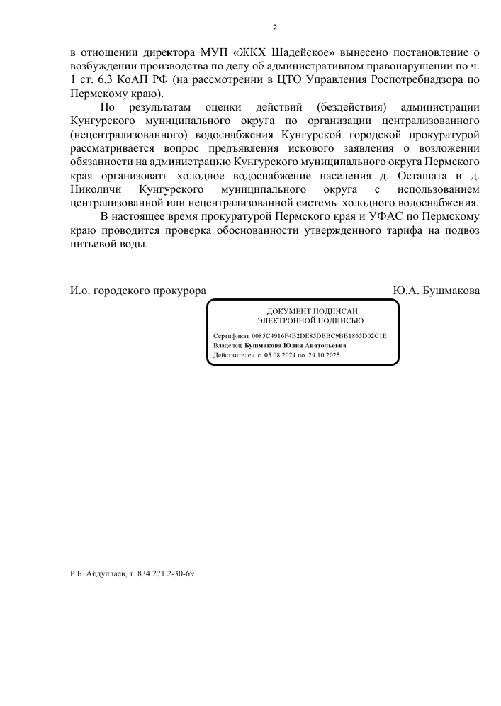 Кроме того, прокуратура Кунгурского района возбудила производство по делу об административном правонарушении по факту необеспечения жителей питьевой водой. Вопрос о возложении обязанности на администрацию Кунгурского муниципального округа организовать централизованное водоснабжение, как для деревни Осташата, так и для Николичи, рассматривается прокуратурой Пермского края.