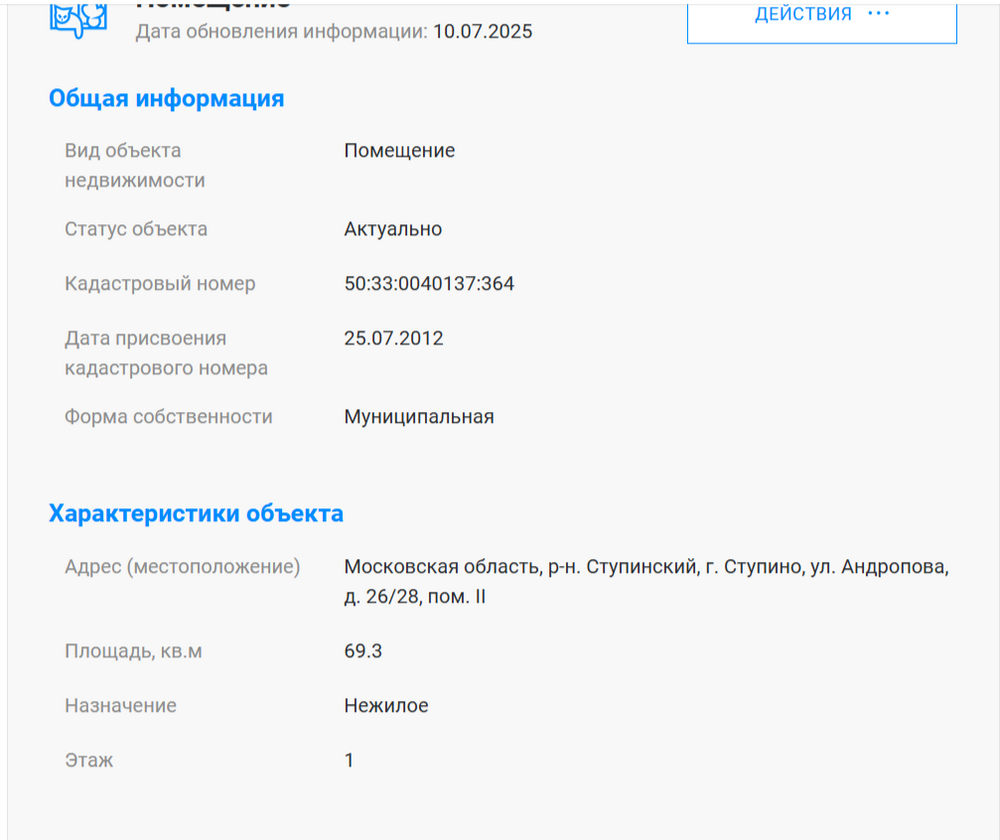 Администрация ответила, что помещение находится в частной собственности. Нагло врут. Доказательством служит информация, которая находится в документе «Перечень объектов недвижимого имущества, находящихся в собственности Городского округа Ступино». Данный документ опубликован на сайте Ступинской администрации в разделе «Муниципальное имущество». Отчёт выложен по состоянию на 01.07.2025 года.