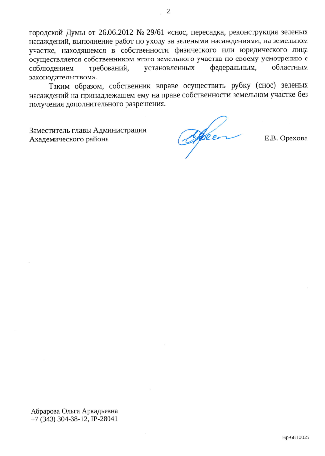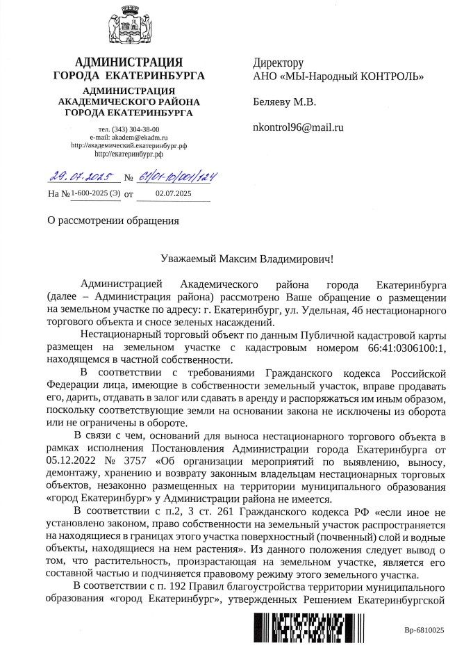 В ответе администрации Академического района указано, что киоск установлен на земельном участке, находящемся в частной собственности. Согласно законодательству, владелец участка вправе распоряжаться своей землей, включая снос зеленых насаждений, без дополнительного разрешения. Поэтому оснований для демонтажа киоска или восстановления деревьев у администрации нет.