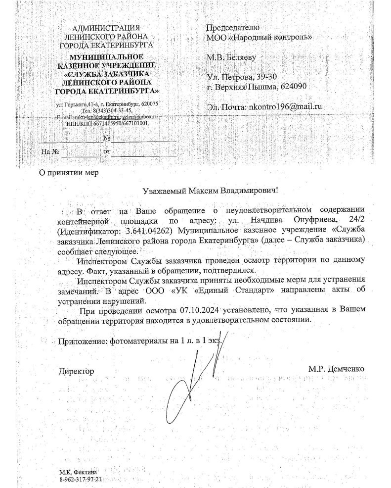 В ответ на обращение, Служба заказчика Ленинского района провела инспекцию и подтвердила факт нарушений. Для устранения замечаний были направлены акты в адрес ООО «УК «Единый Стандарт». По результатам повторного осмотра 7 октября 2024 года, контейнерная площадка находилась в удовлетворительном состоянии, что подтверждается фотоматериалами.
