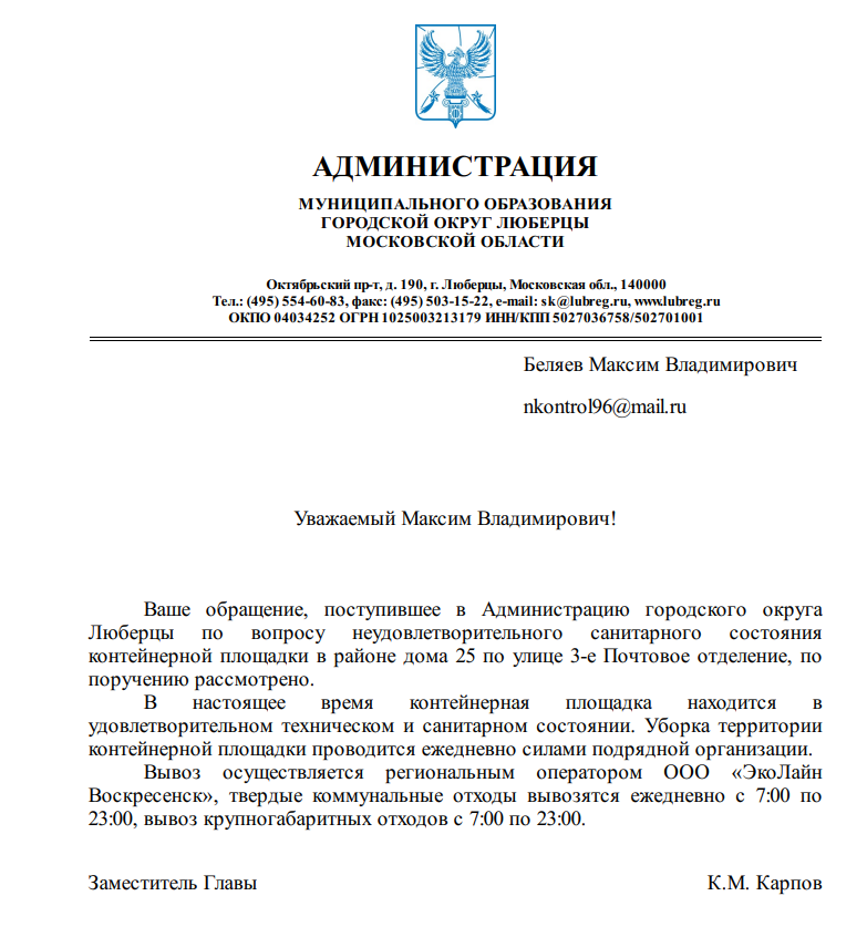 В ответ сообщалось, что в настоящее время контейнерная площадка находится в удовлетворительном техническом и санитарном состоянии. Уборка территории осуществляется ежедневно силами подрядной организации, а вывоз твердых коммунальных отходов производится региональным оператором ООО «ЭкоЛайн Воскресенск» с 7:00 до 23:00, вывоз крупногабаритных отходов также проходит в указанные часы.