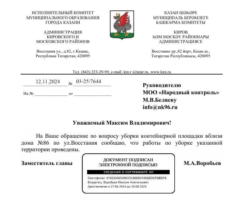 Благодарим неравнодушных граждан за Ваши обращения. Если Вы не согласны с данным ответом Администрации Кировского и Московского районов города Казани, пожалуйста, сообщите об этом Нам (желательно с фото/видео доказательствами выполнения работы в неполном объеме или ее невыполнении).