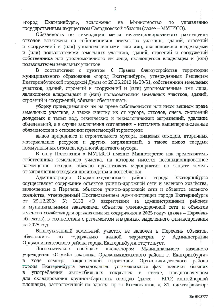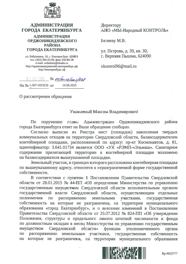 Установлено, что балансодержателем проблемной контейнерной площадки является ООО «УК «РЭМП-«Эльмаш», который не обеспечил надлежащее содержание территории. Земельный участок относится к неразграниченной государственной собственности, поэтому ответственность также возложена на Министерство по управлению государственным имуществом Свердловской области (МУГИСО). Администрация района направила официальные обращения к указанным организациям с требованием устранить нарушения.