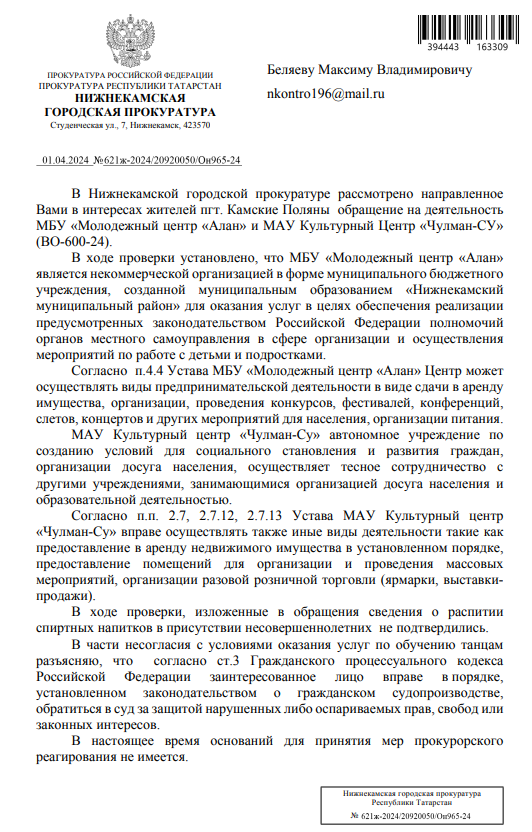 В Нижнекамской городской прокуратуре рассмотрено направленое Вами в интересах жителей пгт. Камские Поляны обращение на деятельность МБУ «Молодежный центр «Алан» и МАУ Культурный Центр «Чулман-СУ» (ВО-600-24).