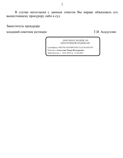 Благодарим неравнодушных граждан за Ваши обращения. Если Вы не согласны с данным ответом Нижнекамской городской Прокуратуры, пожалуйста, сообщите об этом Нам (желательно с фото/видео доказательствами выполнения работы в неполном объеме или ее невыполнении).