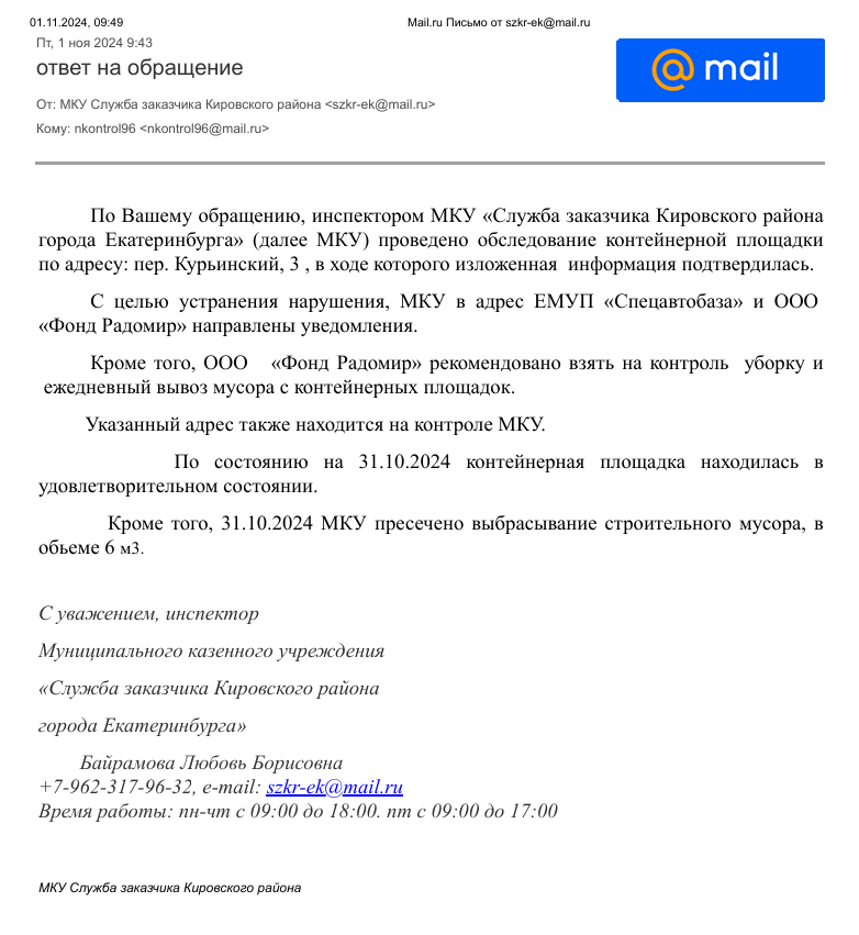 Ответ сообщает, что инспектор МКУ проверил контейнерную площадку по указанному адресу и подтвердил изложенные факты. Чтобы устранить проблему, МКУ направило уведомления в адрес ответственных организаций — ЕМУП «Спецавтобаза» и ООО «Фонд Радомир». Компаниям было рекомендовано наладить регулярный вывоз мусора и ежедневный контроль чистоты на площадке.