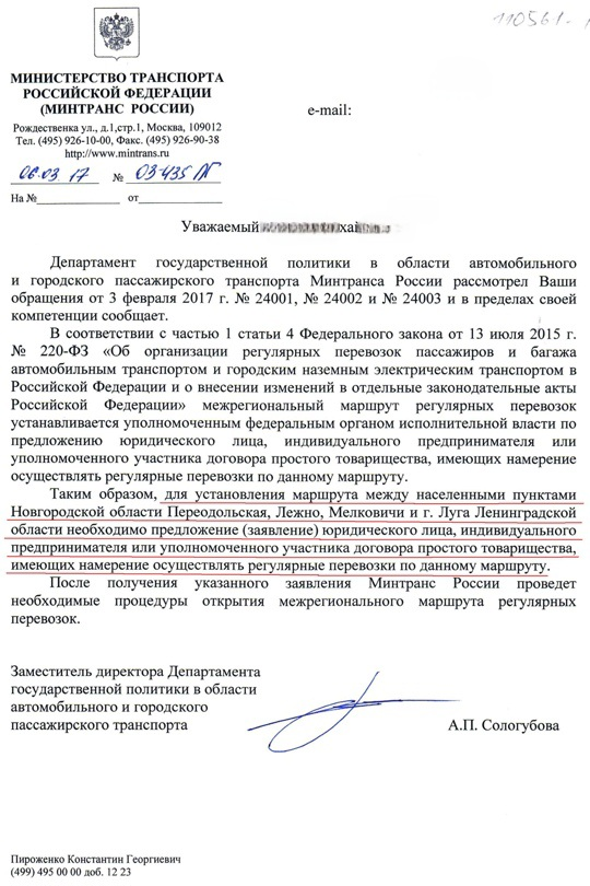 Просим запустить автобусное движение, так как такси до Луги стоит уже больше 1000 рублей, а до Новгорода многим не доехать физически — дорога занимает 2 часа. Раньше автобус до Луги ходил 3 раза в день (при СССР), можно было утром уехать, сделать дела (врачи, магазины) и вечером вернуться, и государство заботилось о населении. Теперь, так как это 2 соседних региона, они отвечают только за свой регион, а то, что Луга в 2 раза ближе, никого не волнует. 7 лет назад Минтранс России прислал какую-то отписку, прикладываем. Помогите пенсионерам и старикам вернуть автобус до Луги.