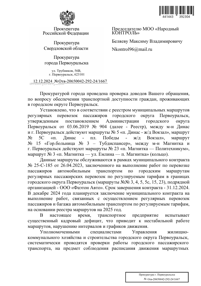 В ходе проверки установлено, что маршруты, обслуживающие микрорайон Магнитка, включены в реестр муниципальных маршрутов, утверждённый постановлением администрации Первоуральска от 03.06.2019 №904. Среди них №23 («п. Магнитка — Политехникум») и №3 («п. Магнитка — ул. Емлина — п. Магнитка»).