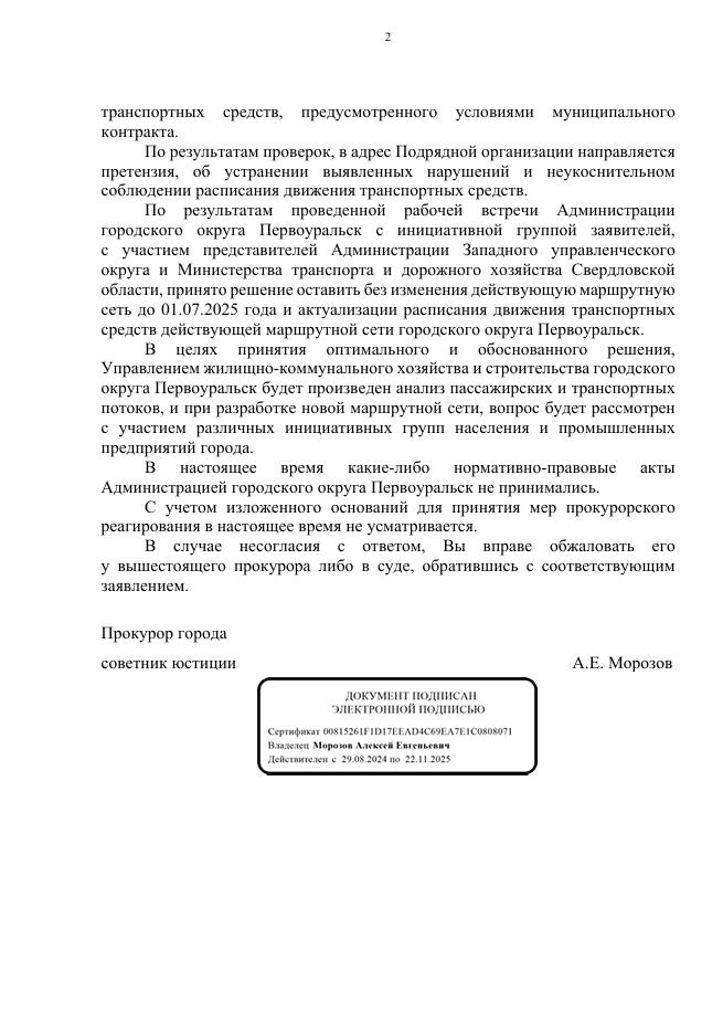 Администрация Первоуральска провела рабочую встречу с инициативной группой жителей, представителями Западного управленческого округа и Министерства транспорта Свердловской области. По итогам обсуждений было принято решение сохранить существующую маршрутную сеть до 1 июля 2025 года. За это время планируется провести анализ пассажиропотока и актуализировать расписание движения. Также было обещано учитывать мнения инициативных групп населения при разработке новой маршрутной сети.