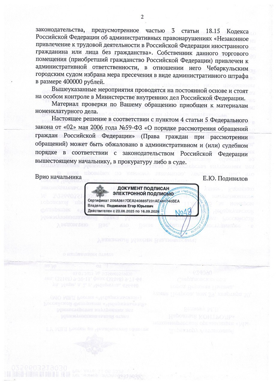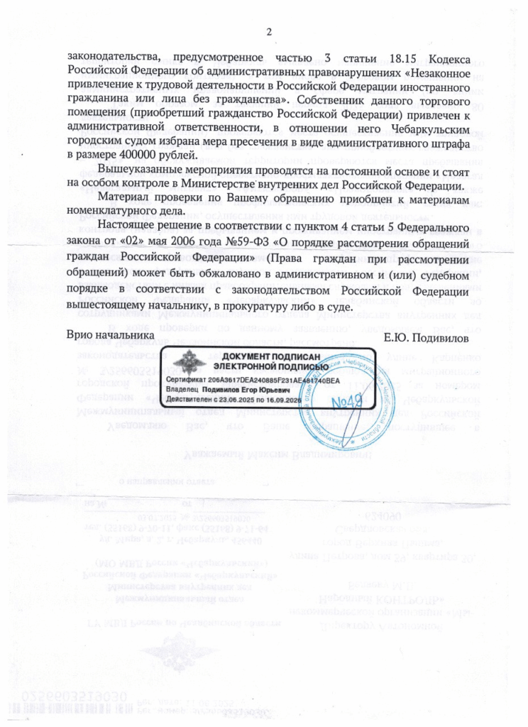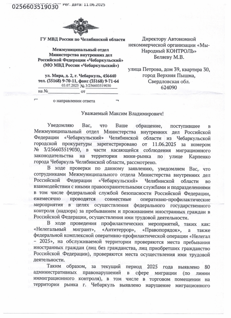Недавно был получен новый ответ, на этот раз от Межмуниципального отдела МВД России «Чебаркульский».