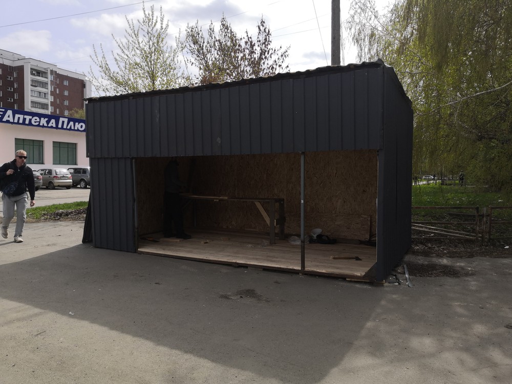 Челябинск, ул. Братьев Кашириных, 97. 26 апреля, мигранты строят киоск.