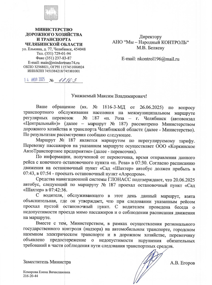 Ведомство подтвердило, что перевозчиком маршрута является ООО «Коркинское автотранспортное предприятие», а рейс действительно должен проходить остановку «Сад Шахтёров» в 07:43. По данным системы ГЛОНАСС, 20 июня автобус проехал остановку в 07:42:36. Водитель заявил, что остановка была пуста, однако с ним проведена разъяснительная беседа. Перевозчику вынесено предостережение о недопустимости нарушений маршрута и расписания.