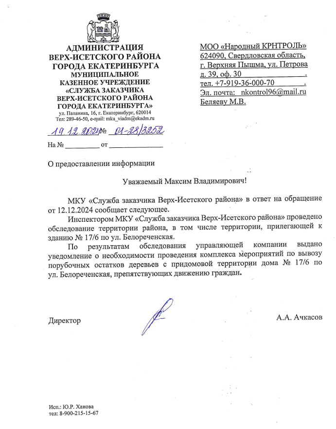 В ответ на обращение инспектор МКУ «Служба заказчика Верх-Исетского района» провел проверку прилегающей территории. В результате обследования было выдано уведомление управляющей компании о необходимости срочно провести уборку порубочных остатков, которые препятствовали движению граждан.