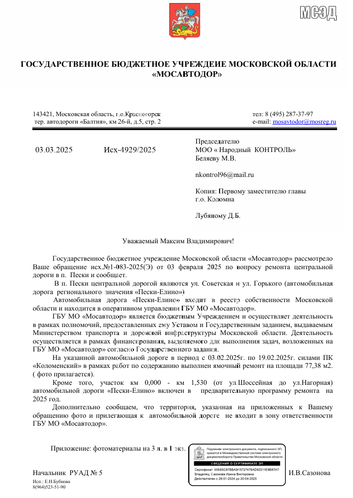 В сообщении указано, что центральной дорогой в посёлке являются улицы Советская и Горького, относящиеся к автомобильной дороге регионального значения «Пески-Елино». Она входит в реестр собственности Московской области и находится в ведении ГБУ МО «Мосавтодор».