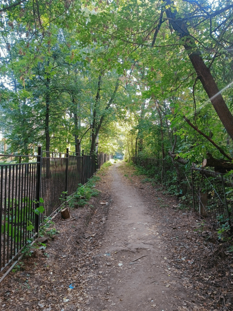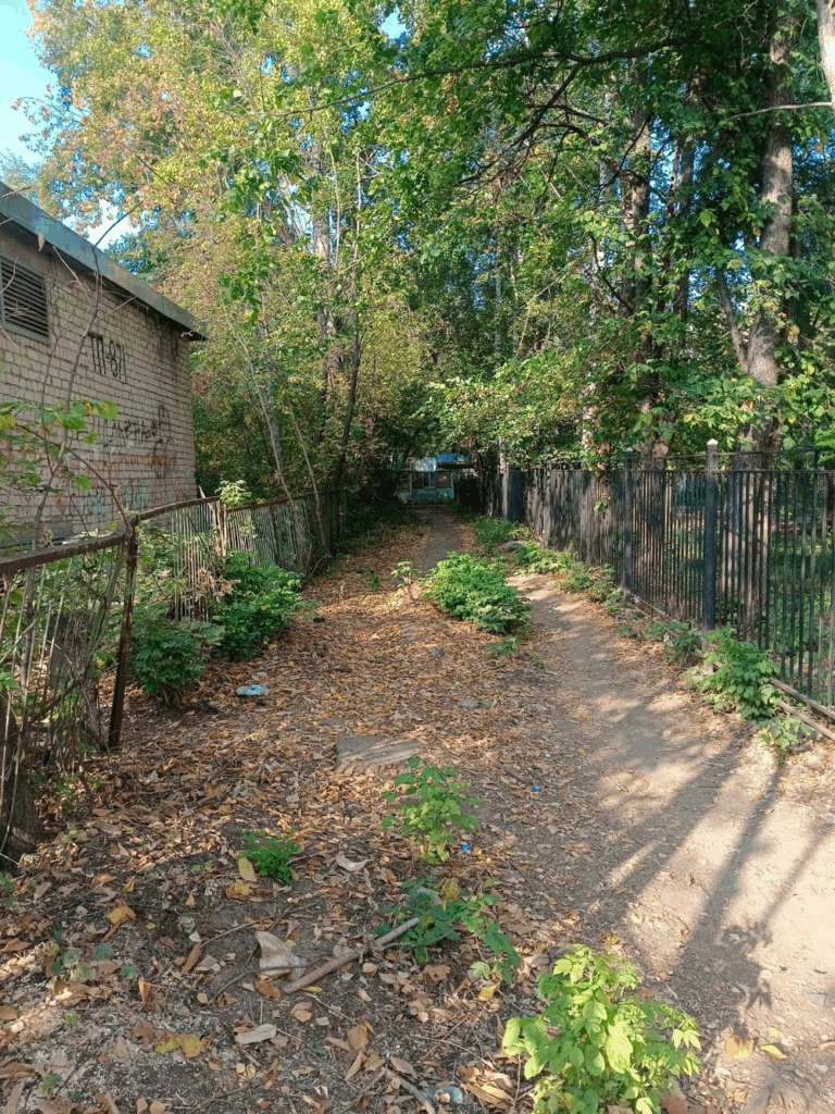 19.09.24. Город Казань, Республика Татарстан. Это проход между школой №10 и ЦВР Приволжского района на улице Братьев Касимовых. Проход через школу на рынок на улице Мавлютова невозможен, так как школа полностью закрывает свою территорию. Остается только этот проход между заборами, где горы битого стекла, ветки и мусор. Прошу облагородить территорию.