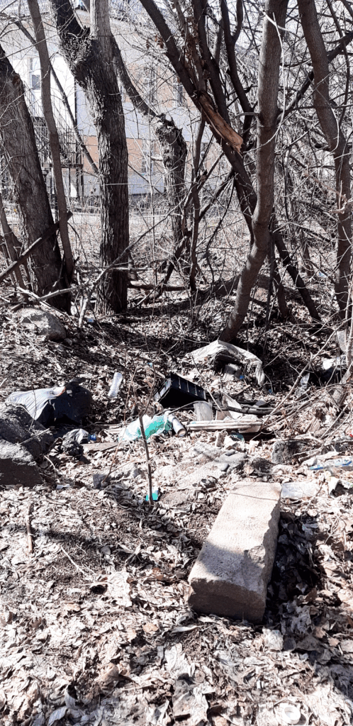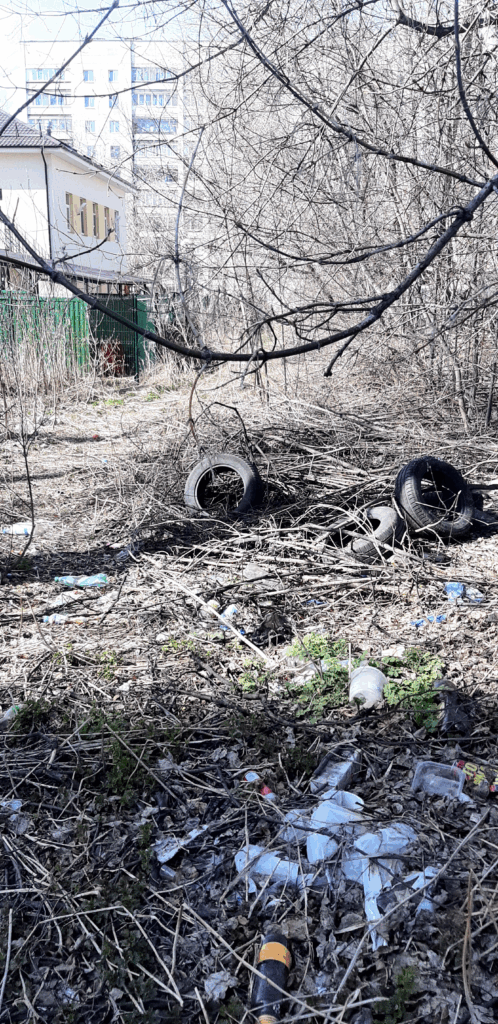 Многолетняя свалка мусора и поваленные сухие деревья возле тропинки рядом с детским садом № 170, зданием суда и стоянкой. Екатеринбург, район ул. Корепина, 17 — Краснофлотцев, 16.