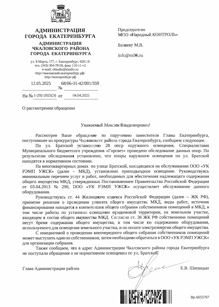 В начале апреля из Екатеринбурга было получено обращение о проблеме неосвещённого участка между жилыми домами в районе улицы Братской. По словам заявителя, в ночное время передвигаться по тёмному двору небезопасно, а все обращения в организации, включая УК РЭМП УЖСК, «Россети» и «Екатеринбургэнергосбыт», не дали результата.