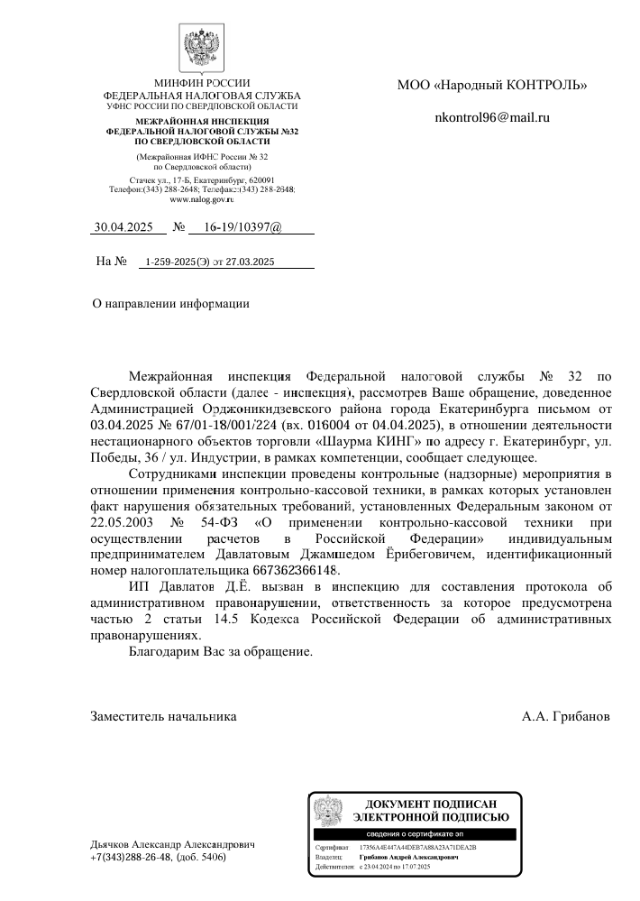 30 апреля ИФНС России по Свердловской области сообщила, что по итогам проверки выявлены нарушения в применении кассовой техники. Индивидуальный предприниматель Давлатов Д.Ё. вызван в инспекцию для составления протокола об административном правонарушении по статье 14.5 КоАП РФ.