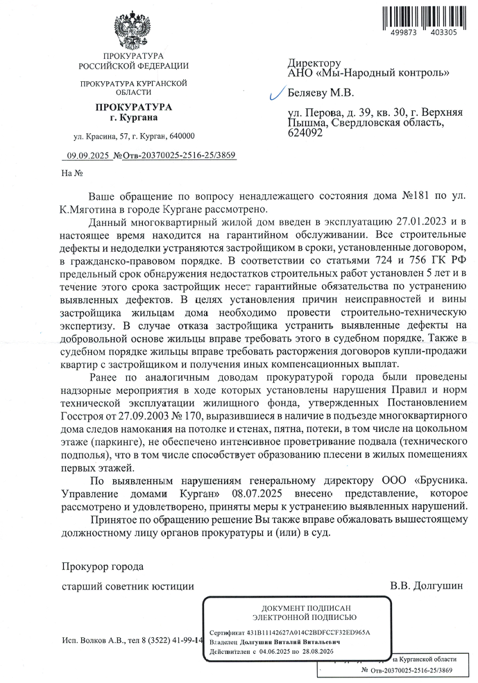 12 августа на ресурсах «Народного контроля» выходил сюжет, посвященный проблемам жилого комплекса «Резиденция» в Кургане. Жильцы дома №181 на улице К. Мяготина рассказали о критических нарушениях, с которыми они столкнулись всего через два года после заселения. По их словам, после каждого дождя в квартирах начинаются настоящие потопы из-за грубых ошибок в гидроизоляции. Также они сообщили о неисправной электропроводке, создающей угрозу пожара, и активно разрушающемся фасаде здания.