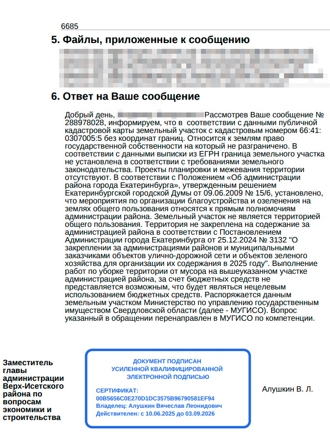В официальном ответе администрации указано, что земельный участок (кадастровый номер 66:41:0307005:5) имеет неразграниченную госсобственность, а его границы не установлены. Из-за отсутствия проектов межевания и планировки территория не отнесена к зоне ответственности районной администрации. Чиновники сослались на постановление № 3132 от 25.12.2024, согласно которому уборка за счет бюджета будет «нецелевым расходованием средств», и перенаправили вопрос в МУГИСО.