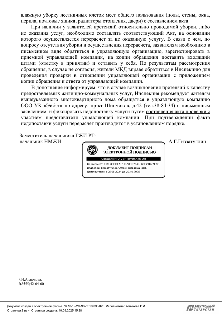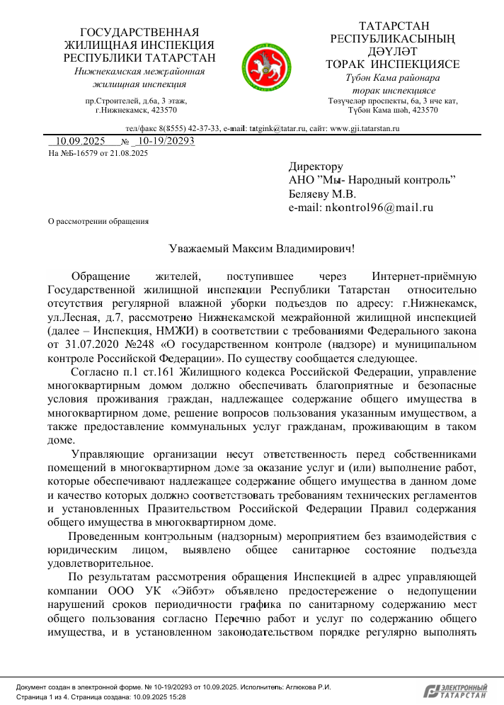 ГЖИ признала общее санитарное состояние подъезда удовлетворительным, однако выявила нарушения периодичности уборки. В адрес управляющей компании ООО УК «Эйбэт» направлено предостережение о недопущении срывов графика санитарного содержания мест общего пользования.