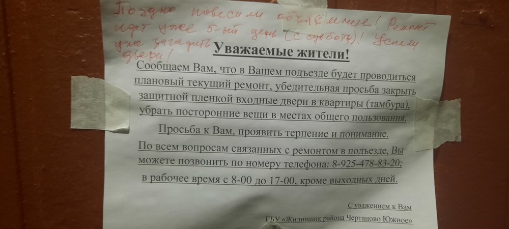 Город Москва, улица 3-й дорожный проезд д 6 корпус 2, 1 подъезд. Ведутся ремонтные работы с 1.02.2024 года, объявление вывешено не было своевременно, а именно 5.02.2024 года, когда половина дверей была испорчена краской. Кто возместит ущерб жителям данного подъезда?. Ремонтные работы производятся не качественно. Контроль за ремонтом отсутствует. В подъезде присутствует жуткий запах краски. Прошу Вас незамедлительно разобраться с этой ситуацией и дать ответ. В подъезде проживают маленькие дети и люди пожилого возраста